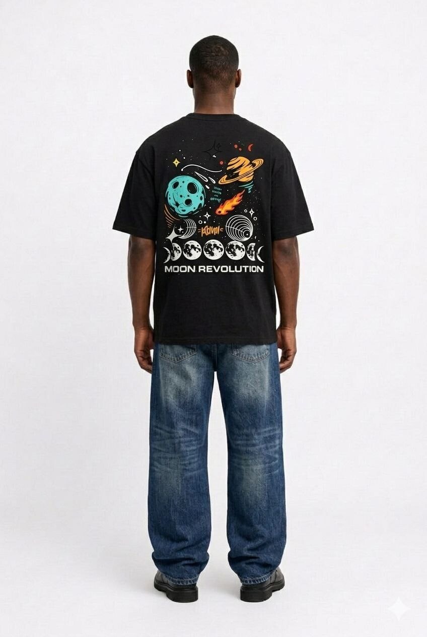 Explore the universe with the Moon Revolution Oversized Tee. This bold graphic design features cosmic elements, planets, and lunar phases representing movement, change, and limitless possibilities. Crafted for streetwear lovers, this tee combines comfort with a futuristic aesthetic that stands out from the crowd. ✔ Premium cotton fabric ✔ Oversized streetwear fit ✔ High-quality back graphic print ✔ Soft, breathable & durable ✔ Designed for everyday style Style Tip: Pair it with baggy denim and sneakers for the perfect street look.